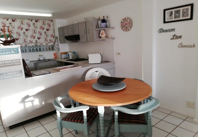 The kitchen is fully equipped with a stove, oven, fridge, microwave, crockery and cutlery. The living area has a small dining table and space for two additional guests. The living area also opens up onto sea-facing balcony with chairs and a table for alfresco dining, or that sunrise cuppa coffee or for some sun-downers all while enjoying those 180 degree Indian Ocean views!