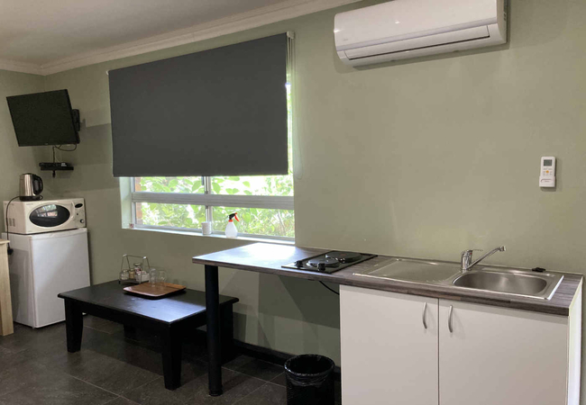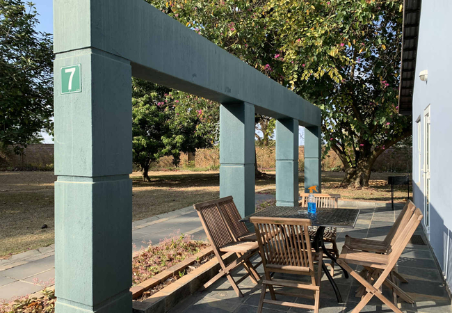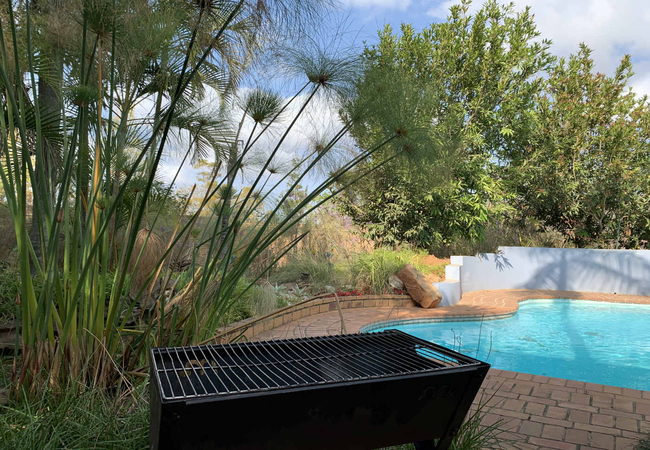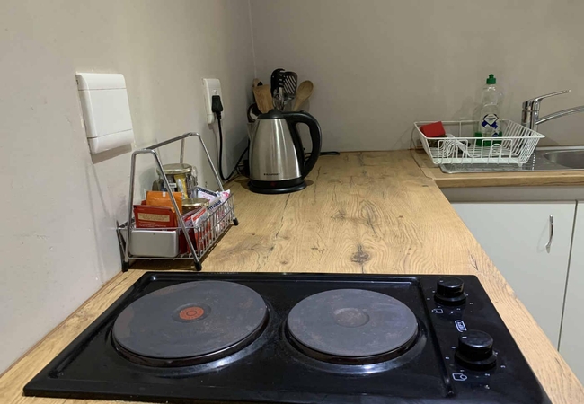 Self catering unit with kitchenette and AC. One room with Queen bed and second room with 2 single beds. Full DTSV. Ensuite shower. Large patio. Own entrance and possible to park in front of the room. Ideal for for families, friends or contractors.