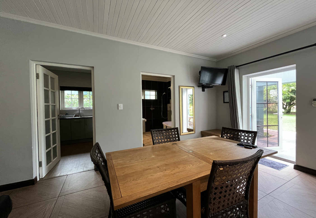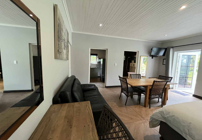 Spacious luxury self catering with AC and kitchen (fridge, 4 plate hob and microwave), en-suite bathroom with bath and shower, wardrobe, seating area, dining area, private patio and full DStv. Own entrance with parking in front. Ideal for couples.