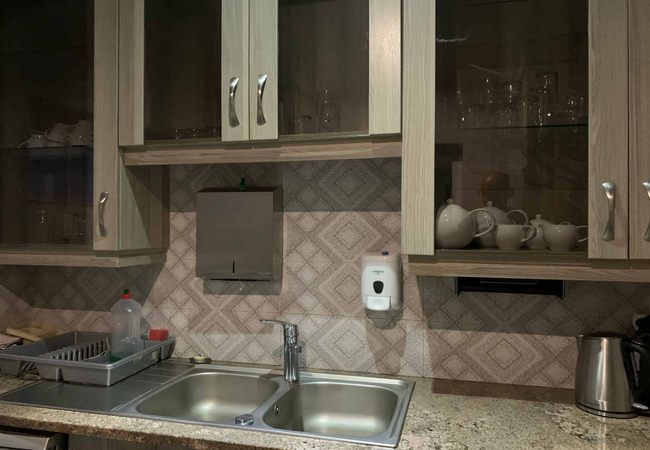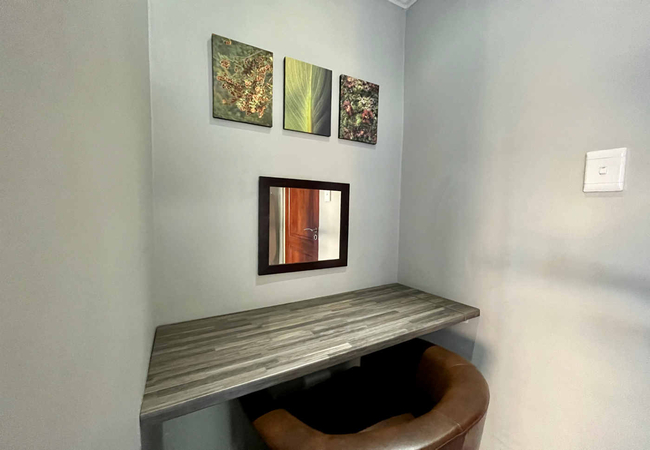 Spacious room with double and a bunk bed, en-suite bathroom with shower. DStv, fan and heater, hospitality tray, fridge, microwave. Desk, 2-seater sofa and wardrobe. Own entrance with parking in front of the room. Ideal for families with children and contractors.