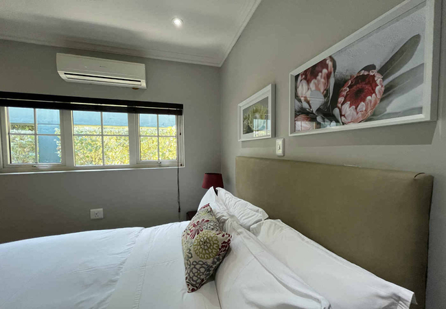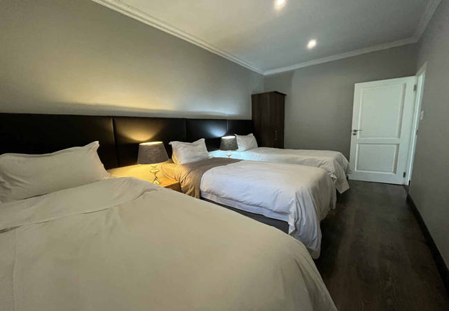 Large self-catering apartment 4 bedrooms with en-suite bathrooms (sleeping 8 guests) with a large private lounge and kitchen. 3 bedrooms have queen / double beds and one can be two single or one king beds. Close to the swimming pool and lapa.