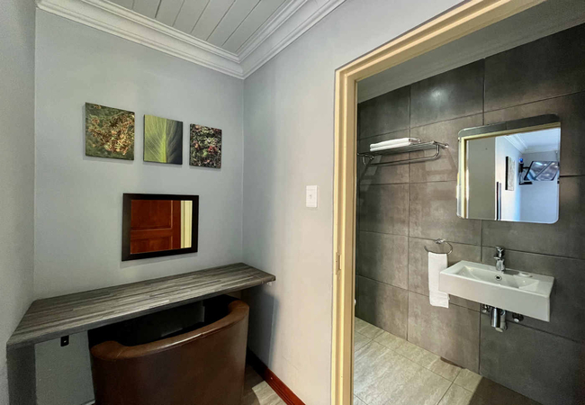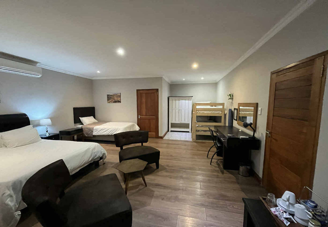 Spacious luxury AC room with queen and single beds, en-suite bath / shower. Seating area, desk, fridge, microwave,full DSTV, hospitality tray and wardrobe. Covered patio, private entrance and parking in front. Ideal for couples or parents with one child.