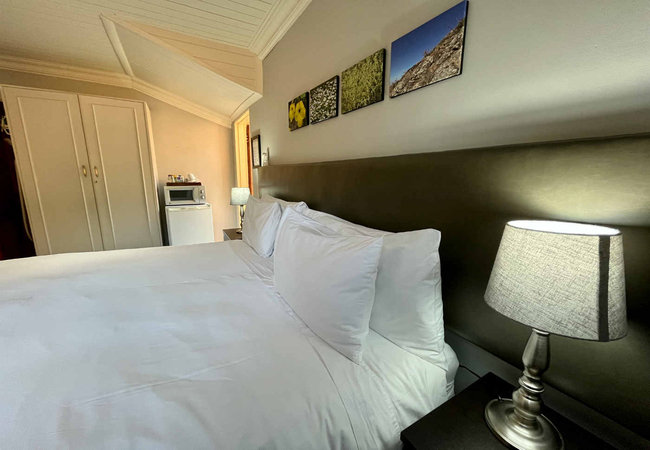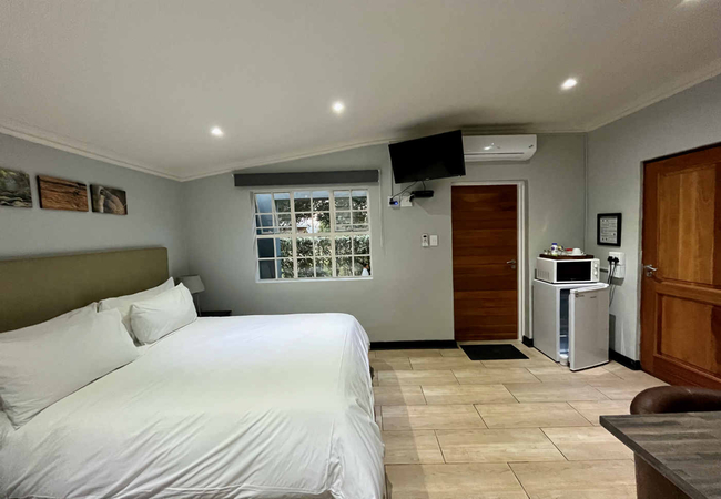 Standard room with King or Twin beds, ensuite bathroom with shower. DSTV, fan and heater, hospitality tray with tea and coffee, fridge, microwave and wardrobe. Own entrance with parking in front of the room.
