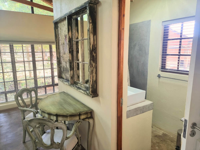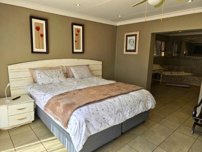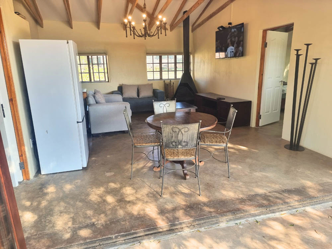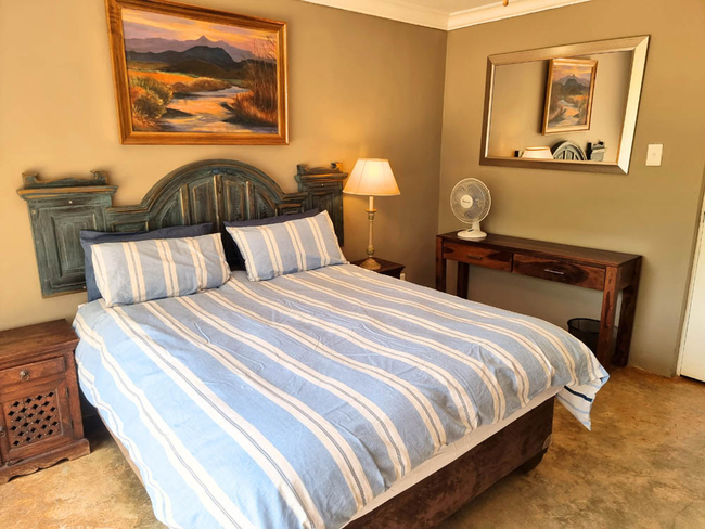 Wild Olive Chalet sleeps four people in two bedrooms with two bathrooms. The first room is furnished with a King-size bed and has an en-suite bathroom fitted with a shower, toilet and basin. The second room is furnished with twin beds and makes use of a separate bathroom fitted with a shower, toilet and basin. Wild Olive Chalet is a fully equipped self-catering facility with an open plan lounge, dining area and kitchenette with a fridge, microwave, kettle, toaster, full gas oven, all cutlery and crockery. A TV, Netflix and full DSTV is included. Our chalet is serviced daily. Outside there is a private braai area situated on a large patio under a magnificent olive tree. Secure parking is available for all guests.