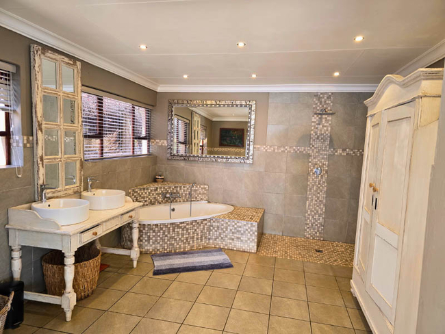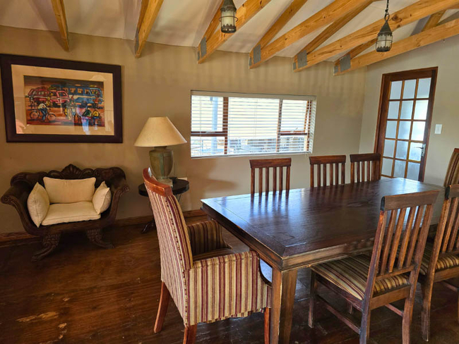 Grapevine House sleeps eight people in four bedrooms furnished with King-size or twin beds (made up on request). There are two en-suite bathrooms fitted with a bath, shower, toilet and basin and a separate bathroom fitted with a shower, toilet and basin. The house has an open plan lounge, fireplace, dining area and a kitchen equipped with a fridge, freezer, microwave, kettle, toaster, double eye level oven with gas stove, all cutlery and crockery. A TV with Netflix and full DSTV is included. Outside there is a private double braai area. The house is serviced daily, and secure parking is available for all guests.