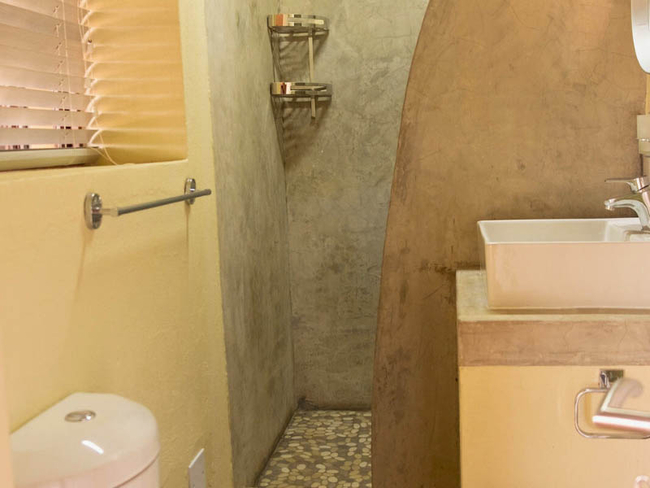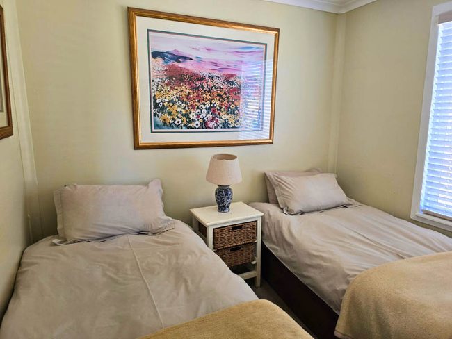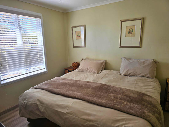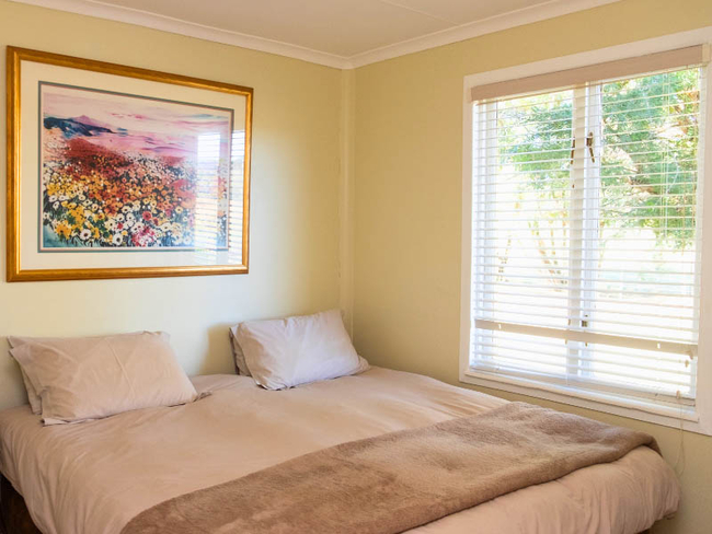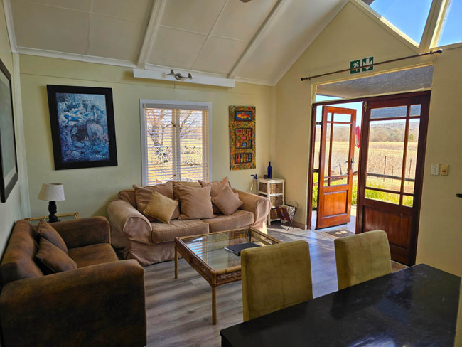 Cottage One sleeps up to five people in two bedrooms furnished with King-size or twin beds (beds made up as required). There is one bathroom fitted with a shower, toilet and basin. There are no TVs, but free Wi-Fi is available. The cottage is fully equipped for self-catering and has an open plan lounge, dining area and kitchenette with a small bar fridge, microwave, kettle, toaster, 2 plate stove, all cutlery and crockery. Outside there is a cold plunge pool and your own braai area. Secure parking with a double shade port is at the back of the cottage.