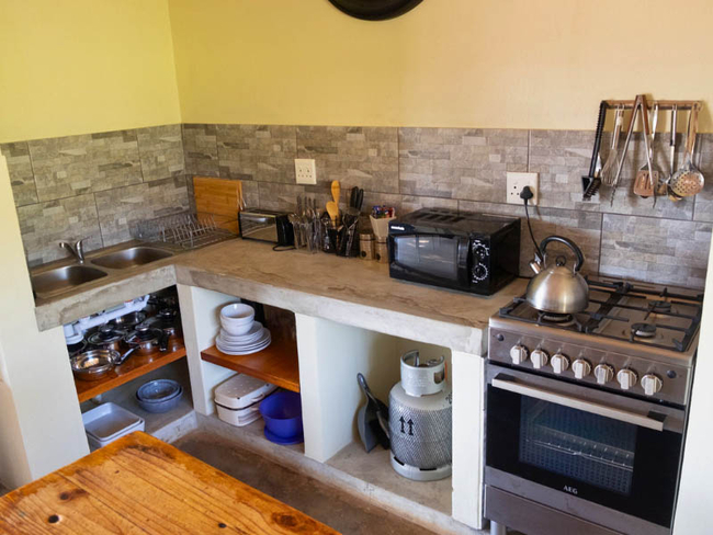 Cottage Three sleeps up to five people in two bedrooms furnished with King-size or twin beds (beds made up as required). There is one bathroom fitted with a shower, toilet and basin. There are no TVs, but free Wi-Fi is available. The cottage is fully equipped for self-catering and has an open plan lounge, dining area and kitchenette with a small bar fridge, microwave, kettle, toaster, 2 plate stove, all cutlery and crockery. Outside there is a cold plunge pool and your own braai area. Secure parking with a double shade port is at the back of the cottage.