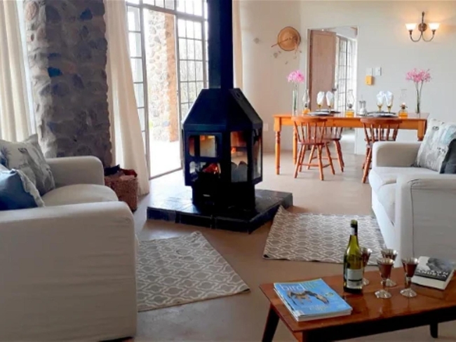 Guinea Fowl Cottage offers a comfortable and well-appointed retreat, featuring a cozy fireplace, inviting couches, and an open-plan living area that includes a sleeper couch. The fully equipped kitchen comes with a refrigerator, microwave, oven, toaster, and a 2-plate stove, making it ideal for self-catering. The cottage has two en-suite bedrooms—one with a king-size bed and the other with two single beds. Guests can enjoy a covered deck with outdoor furniture, braai/barbecue facilities, and beautiful views of the garden, mountains, and surrounding landmarks. Additional amenities include a dining table, ceiling fan, electric blankets, bathroom essentials, hairdryer, iron and ironing board, and both a shower and a bathtub. The cottage is non-smoking, serviced daily, and provides a tranquil setting with both indoor and outdoor dining areas for a relaxing stay.