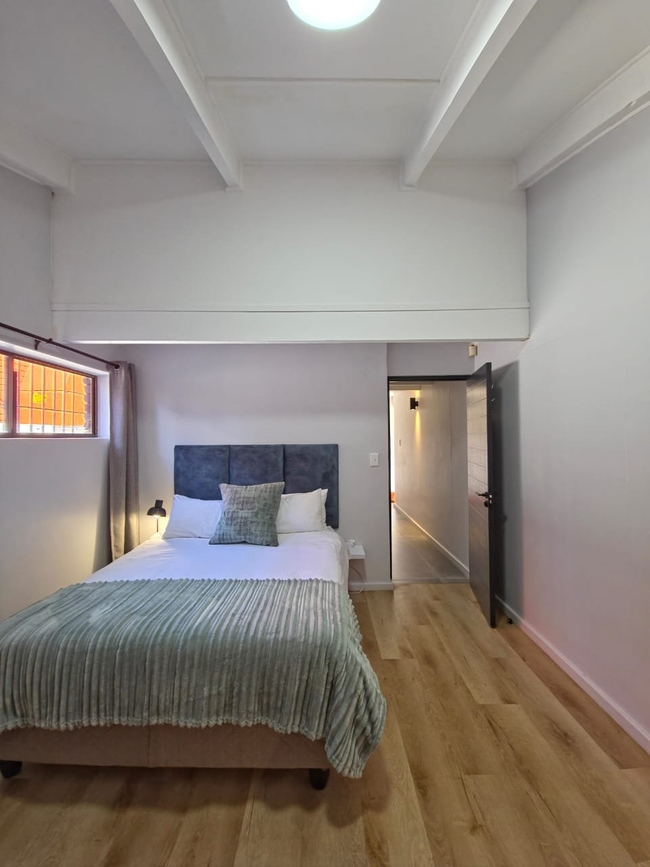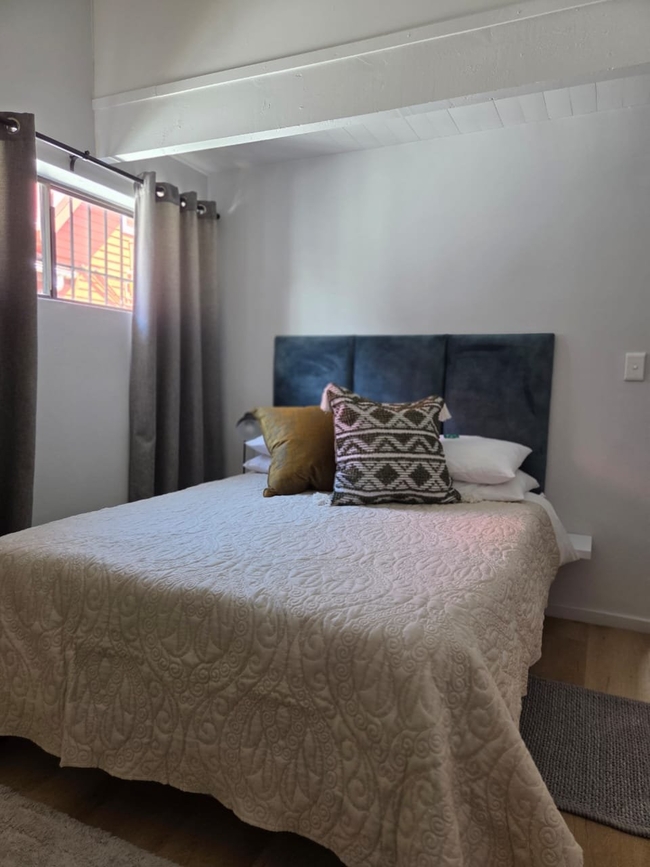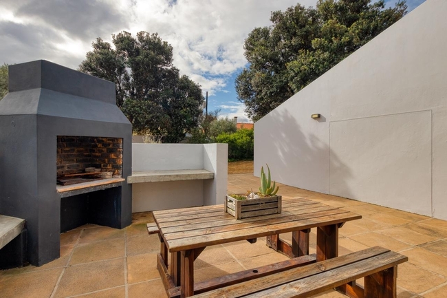 A dining table accommodating eight guests stands adjacent to an indoor built-in braai, perfect for sociable evenings regardless of the weather. There is also an outdoor braai area accessible via the back door. Secure parking is provided behind a remote-controlled gate for added peace of mind.