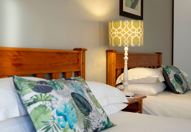 Our Deluxe Rooms consist of two Queen-size beds in an open plan room with modern amenities. This room type is perfectly suited for a family of four. The room leads into an en-suite bathroom which has a large shower or a bath. Each room opens onto its own patio which steps out onto our beautiful garden and are within proximity to our swimming pools.