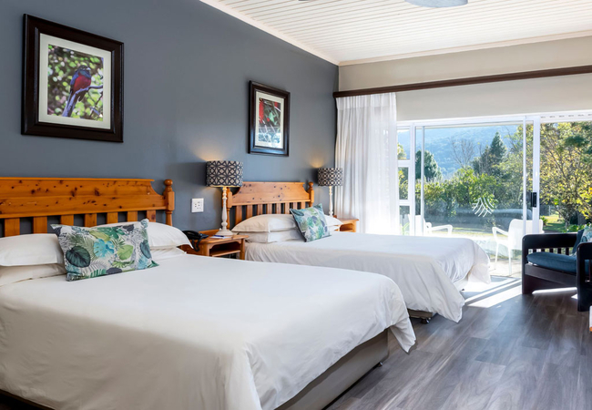 Our Standard Family Rooms give travelling families the opportunity to experience the tranquillity of the Weza Forest together. These rooms feature either two double beds or a king-sized bed and sleeper couch combo.The room leads into an en-suite bathroom which has a large shower. Each room opens onto its own patio looking out onto a tranquil forest setting.