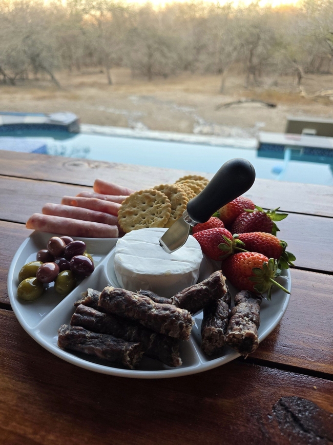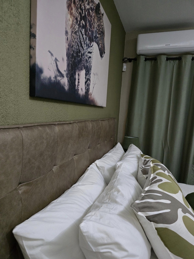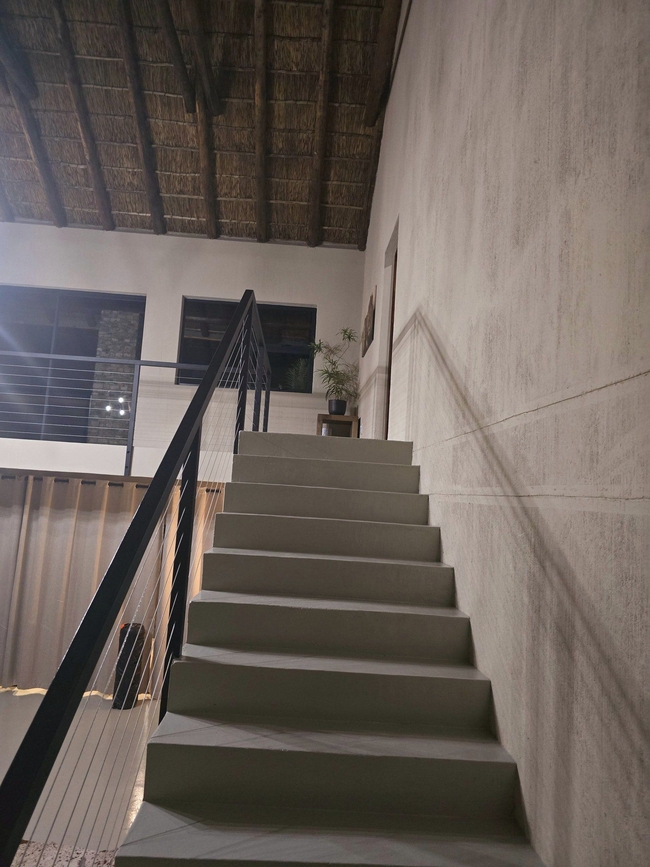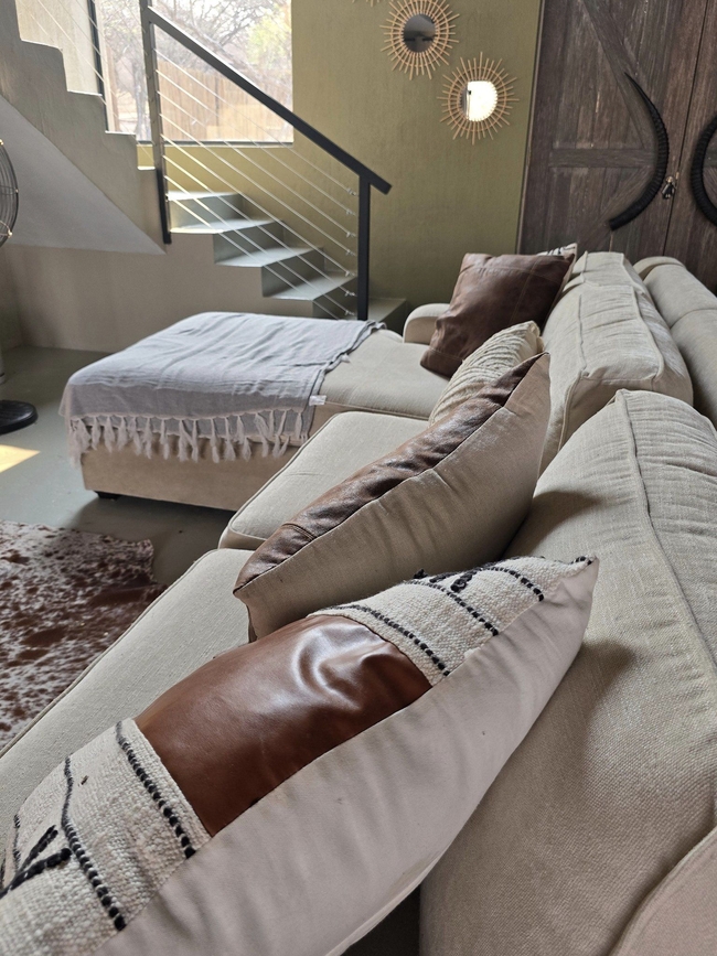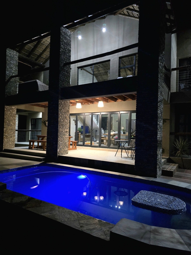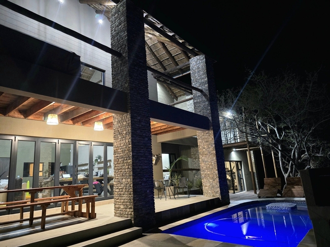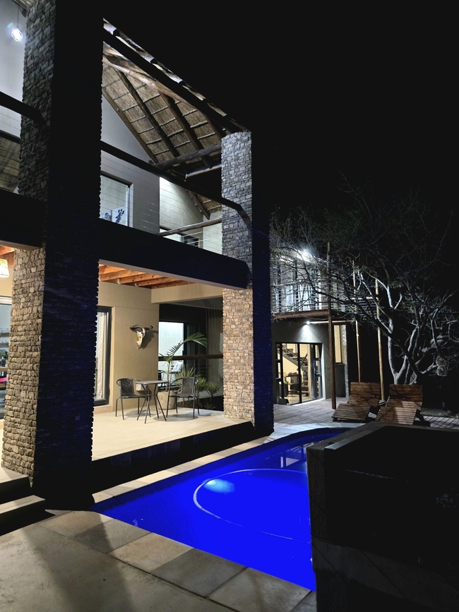 Each bedroom leads to a private patio overlooking the serene landscape. One bedroom is situated in an attached cottage, offering extra privacy for couples or small families. This cozy cottage includes a sleeper couch, a quaint living area, a kitchenette, and its own patio, making it a versatile option within the main home. A fully equipped kitchen complements the spacious living area, which includes a TV and Wi-Fi access. Outdoor amenities feature braai facilities, a refreshing swimming pool, and a Jacuzzi, providing ample options for relaxation. The main kitchen is designed with modern conveniences, including a stove, oven, microwave, and refrigerator, and meals can be enjoyed at the comfortable dining table. The lounge area invites relaxation, offering plush seating, a TV with DStv and Netflix, and complimentary Wi-Fi. The living area seamlessly extends to the primary patio, complete with a built-in braai and a view over the boma, swimming pool, and Jacuzzi.