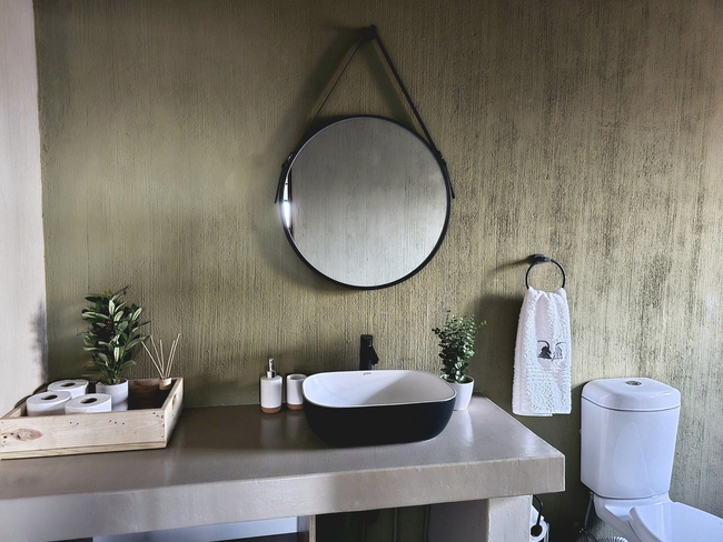 The main kitchen is designed with modern conveniences, including a stove, oven, microwave, and refrigerator, and meals can be enjoyed at the comfortable dining table. The lounge area invites relaxation, offering plush seating, a TV with DStv and Netflix, and complimentary Wi-Fi. The living area seamlessly extends to the primary patio, complete with a built-in braai and a view over the boma, swimming pool, and Jacuzzi.