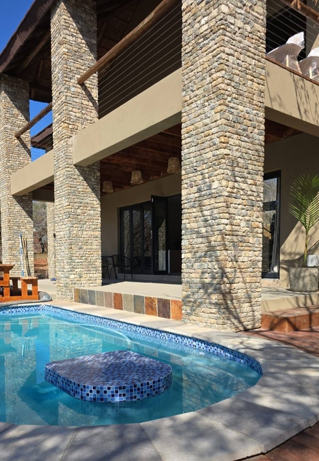 Inkolongwane Bush Lodge presents an exceptional, luxury self-catering retreat for up to 12 guests, located in Marloth Park, adjacent to Kruger National Park. This remarkable holiday home is nestled within a wildlife sanctuary, allowing guests to experience an environment filled with diverse bird species and free-roaming game.