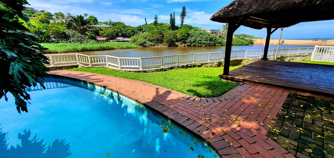 Inn on the Sea 3 is a beautifully appointed apartment situated in a secure complex, positioned on the lagoon and the popular Blue Flag swimming beach. The ground floor features a stylishly furnished lounge with unlimited Wi-Fi and a flat-screen television, creating the perfect setting for relaxation while enjoying panoramic views of the sea and lagoon. A small enclosed garden and a guest toilet are also located on this level. Adjoining the lounge is a spacious dining area with a large table that seats eight. The kitchen is sleek and modern, finished with Caesar stone countertops. It is fully equipped for self-catering, offering a refrigerator, microwave, oven, and stove, together with a dishwasher, washing machine, and tumble dryer to ensure convenience throughout your stay. The first floor houses four well-appointed bedrooms, each fitted with queen-size beds and ceiling fans. Two of the rooms enjoy stunning sea views. The main bedroom includes a modern en-suite bathroom with dual basins, a bath, a shower, and a toilet. A second, equally modern bathroom is also available, complete with a bath, shower, basin, and toilet. The top floor provides an additional lounge area with a built-in bar and kitchenette. From here, a balcony with deck chairs and a kettle braai invites guests to take in the breathtaking views of both the sea and the lagoon. The complex offers a variety of facilities for your comfort and security. These include a swimming pool, a thatched lapa, backup water supply, and a solar system powering the exterior lights. Security features comprise electric fencing, an automated entrance gate, and an alarm system within the apartment. For added convenience, the property includes an automated double garage.