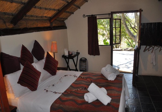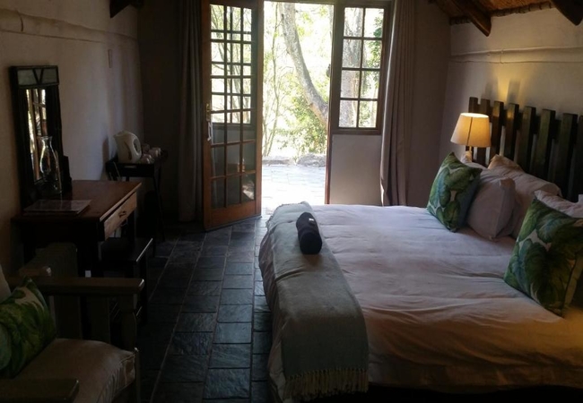 This spacious thatched chalet has a double bed and 2 singles, en-suite with shower and a covered veranda looking out to the dappled light from the indigenous gardens. Includes tea and coffee and standard guest amenities.