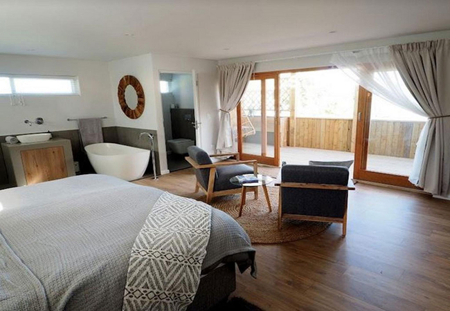 Swartvlei Suite is furnished with a King-size bed or twin beds on request. The en-suite bathroom is fitted with a bath, shower, toilet and basin. All the rooms have Wi-Fi, TV with streaming services and a tea / coffee station. Enjoy sweeping views of the Swartvlei Lagoon from the balcony.