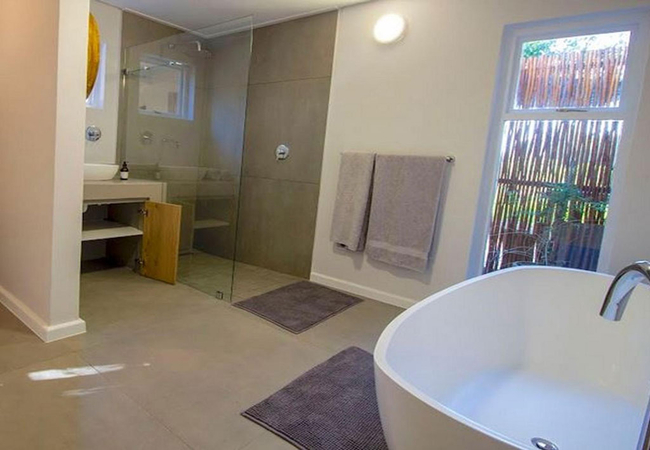 Yellowwood Room is furnished with a King-size bed and has a walk in closet. The bathroom is fitted with a couples shower, bath, two basins and a toilet. All the rooms have Wi-Fi, TV with streaming services and a tea / coffee station. This spacious room has a garden view.