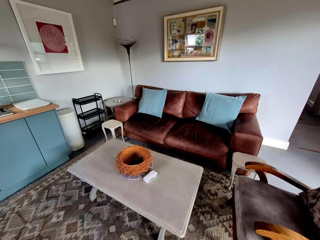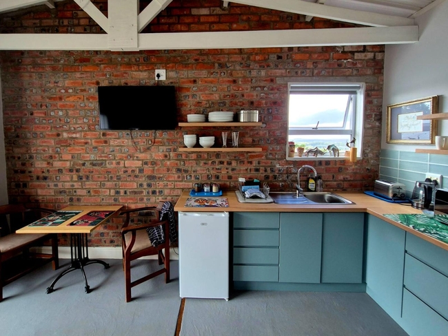The open-plan sitting area provides a cosy space to unwind, complete with a flat-screen TV and access to streaming services like Netflix. A well-equipped kitchen enhances convenience, offering a bar fridge, microwave, two-plate stove, toaster, and all essential crockery, cutlery, and tea and coffee facilities.