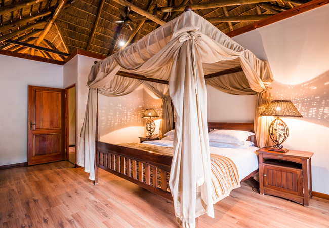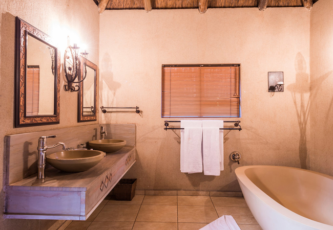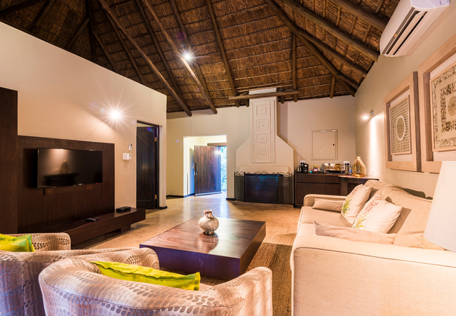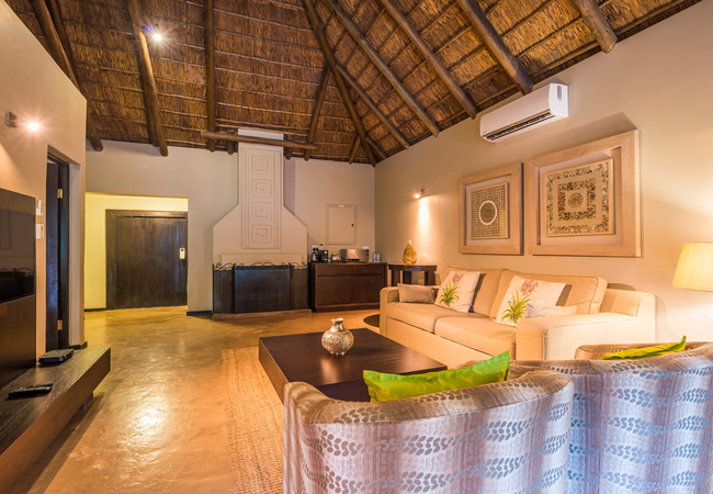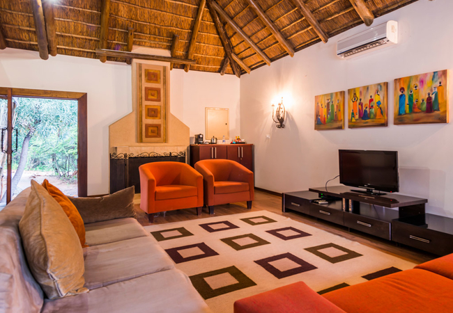 Each of the Luxury Suites feature a range of amenities for your comfort and enjoyment, as well as a relaxing outdoor sitting area, a lounge with a flat-screen TV, and a fireplace for chilly bushveld evenings. These Suites are all tastefully decorated with African décor and come with a King-size, four-poster bed and an en-suite bathroom with a bath. toilet, basin and outside shower. Facilities include air conditioning, a coffee / tea station, a TV with selected DStv / satellite channels, safe, hair dryer, complimentary toiletries and daily housekeeping.