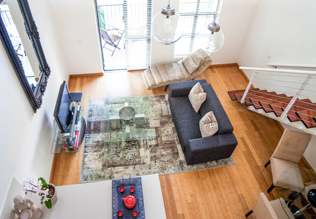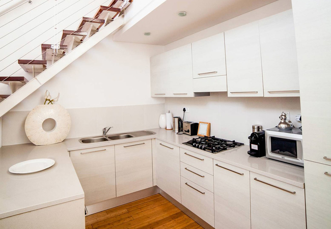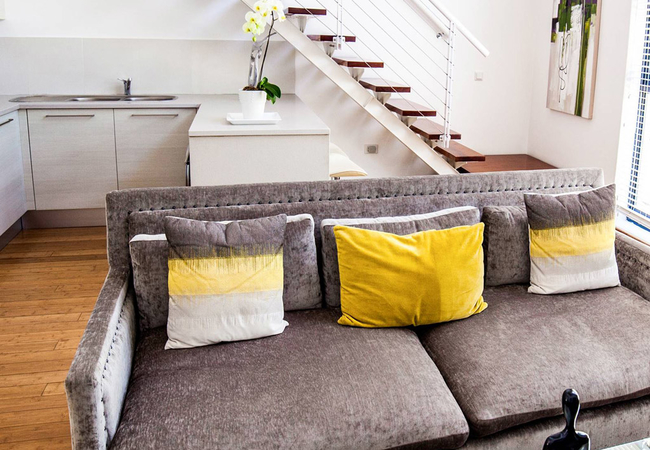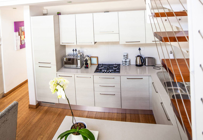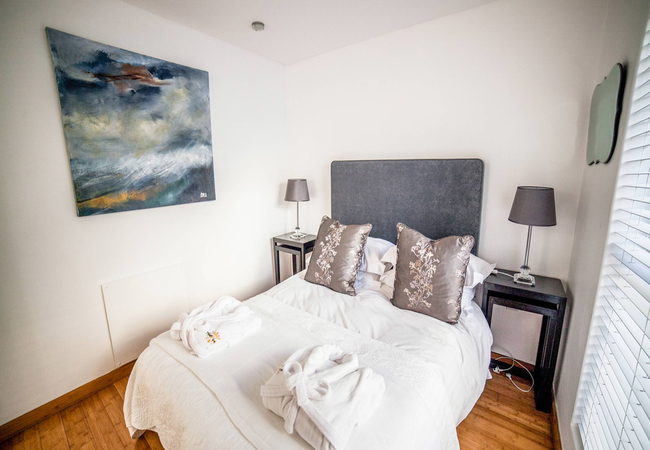 This premium apartment is North-facing and also comes with an air-conditioner fitted in the living area to help cool those gorgeous summer evenings when you're not outside enjoying the views or having Al fresco dinner on the beautiful patio. The contemporary open plan design means the stylish lounge, dining room and kitchen areas all flow tastefully into one another. The dreamy kitchen is fully fitted with a Nespresso coffee machine, microwave and washer/dryer. The main bedroom with its en suite bathroom is located on the spacious mezzanine level. The cozy second bedroom is located on the lower lever with an adjacent bathroom with a shower. This luxury apartment has 2 bedrooms, one equipped with a queen sized bed and the other with a king size. Central Heating is available through the apartment with electric blankets made available during the winter so that the accommodation is as comfortable as home during those crisp winter nights. Our apartments are fully serviced daily.