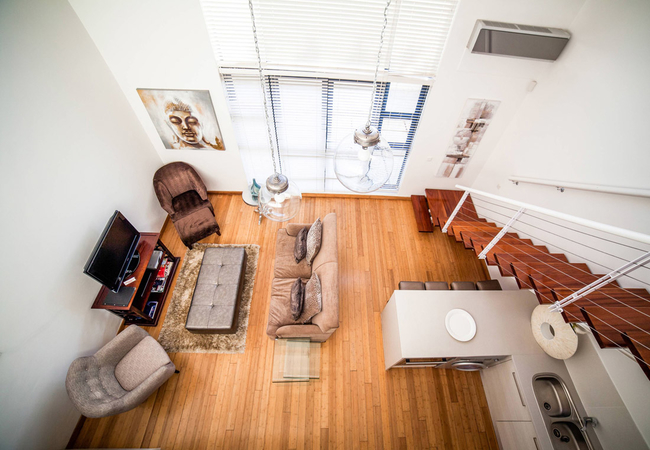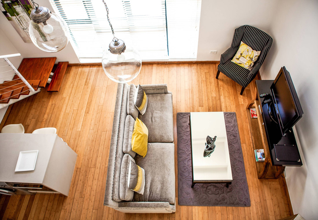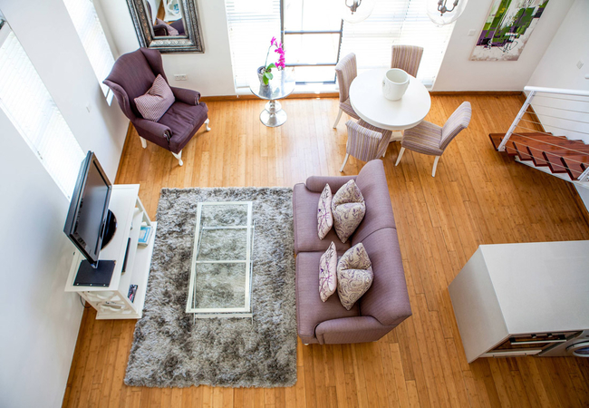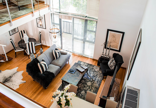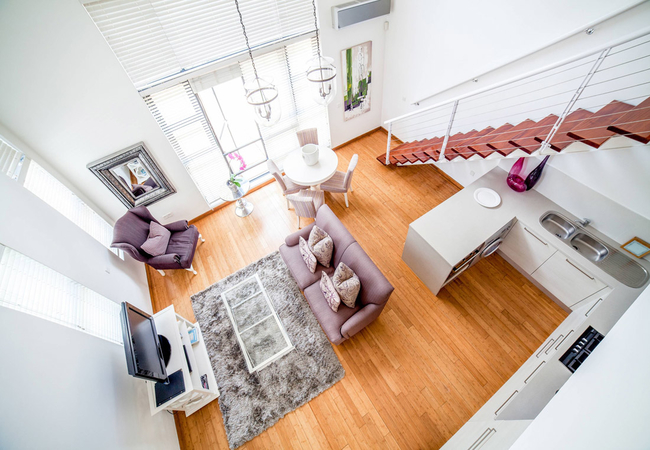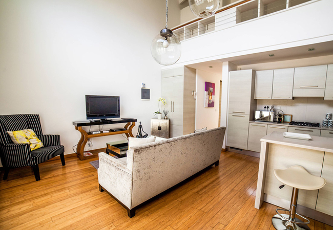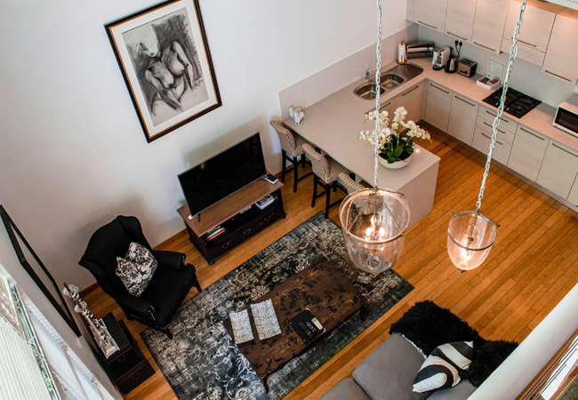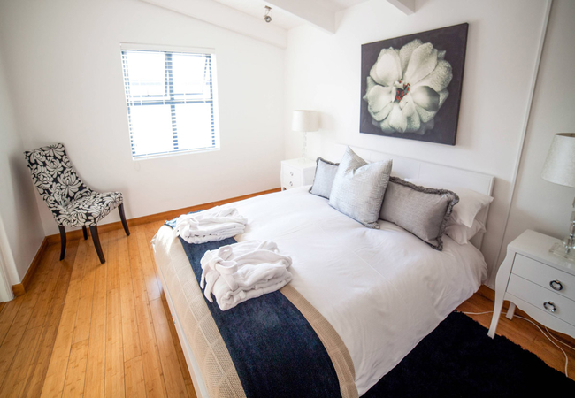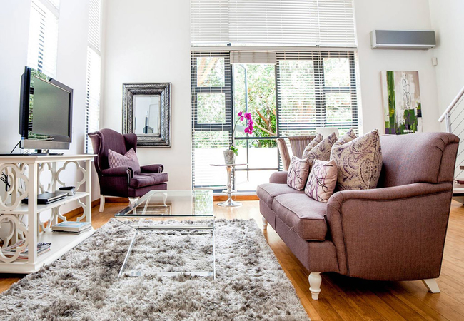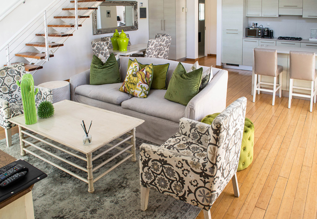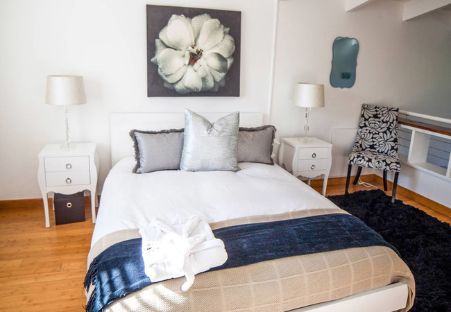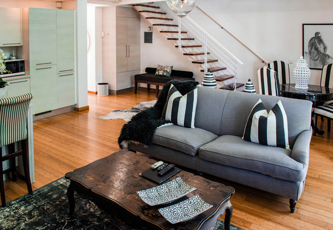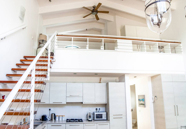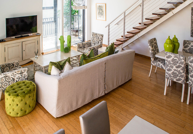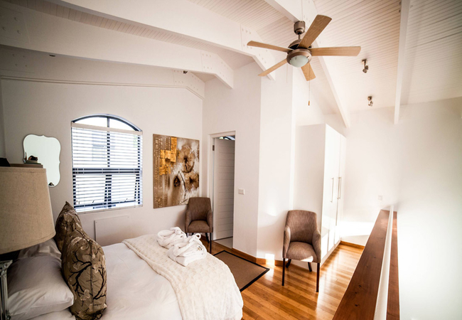 You are first greeted by the open plan lounge, dining and kitchen areas, which lead up to the gorgeous mezzanine level where you will find the inviting main bedroom. The second bedroom is situated on the lower level. The dιcor is stylish with neutral colours to ensure ultimate comfort and relaxation. Turn your gaze towards the window and you are presented with the spectacular Franschhoek mountains. Our apartments still have all the homely comforts, including central heating, a fully fitted kitchen with a washer/dryer and for those that want to catch up on their series, there is DSTV/satellite TV in the air-conditioned lounge. Our apartments are fully serviced daily.