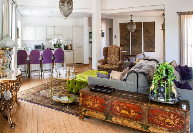 This striking and colourful West-facing apartment has an open plan lounge, dining and kitchen area, which leads up to the warm and inviting mezzanine level where you will find the dreamy main bedroom with its en suite bathroom. The comfortable second bedroom with its double bed is situated downstairs. Standard features of all our luxurious Franschhoek apartments are a fully fitted kitchen, DSTV and satellite, washer/dryer, air conditioning, central heating as well as secure parking and a lock-up garage. This glamorous apartment is situated next to the sparkling pool and deck. Our apartments are fully serviced daily.