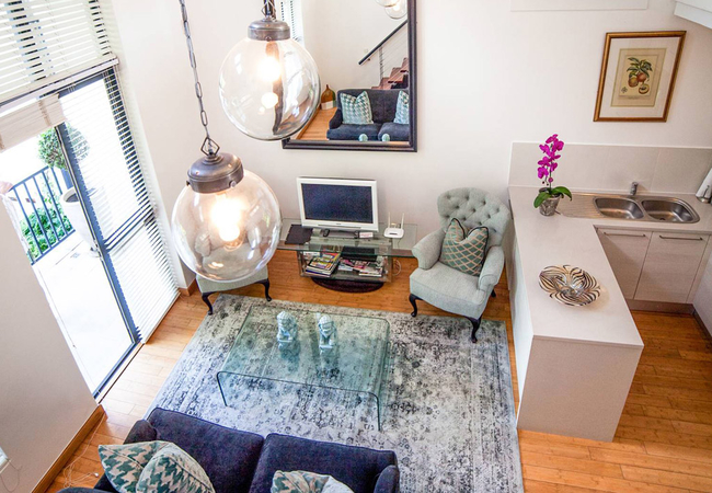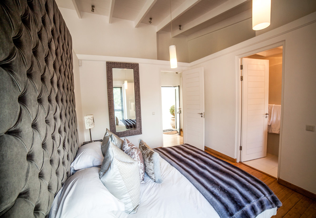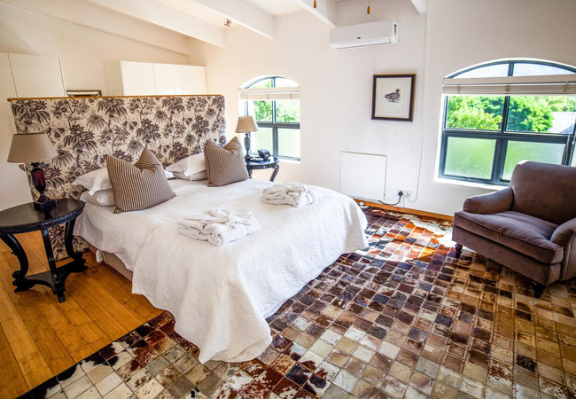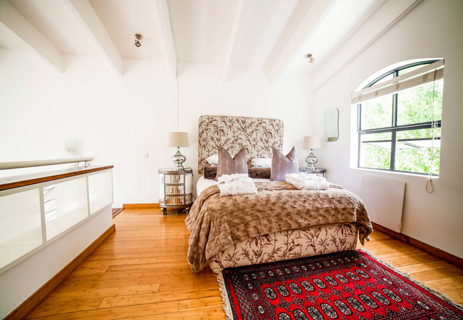 This 2 bedroom apartment is open-plan with a fully equipped kitchen leading straight to the tastefully decorated modern living area that gazes up towards the main bedroom with its full en suite bathroom, located on the spacious mezzanine level. The second bedroom is located on the lower lever with an adjacent bathroom with a shower. You'll find the little balcony of this Northwest-facing suite, the perfect place to relax and enjoy your morning coffee whilst taking in the beautiful Mountain Views of the Franschhoek Valley. As with all the Ivy Franschhoek apartments, there is an air-conditioner with heating fitted in the living area as well as secure parking with a lock-up garage. If you plan to stay in this luxury Franschhoek apartment during the winter, we'll make some electric blankets available so that you can get into bed feeling warm and toasty. Our apartments are fully serviced daily.