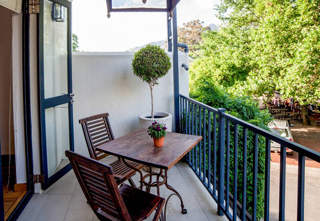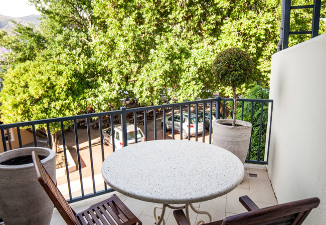 This holiday apartment is street facing with a gorgeous little balcony to sit and enjoy the fresh Winelands air. The main bedroom with its en suite bathroom is located on the mezzanine level with the cozy second bedroom located on the lower lever with an adjacent bathroom with a shower. The lounge, dining and kitchen areas are all open plan. TV/satellite, washer/dryer, air conditioning and central heating are all standard features in this glamorous apartment. Secure parking for your vehicle is available with a lock up garage. Our apartments are fully serviced daily.