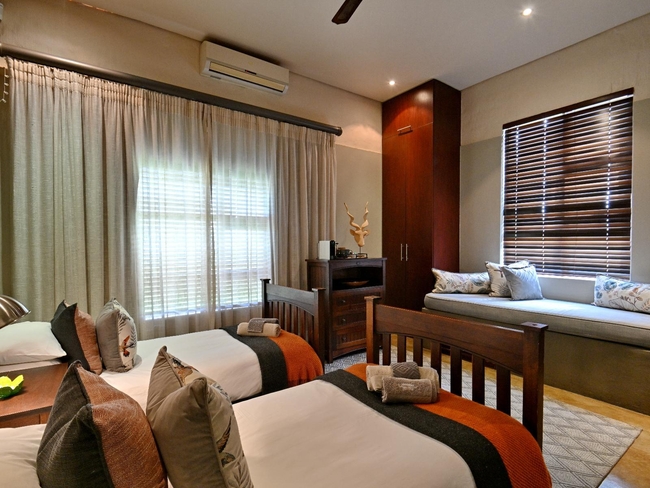 The first bedroom is furnished with a Queen-size bed. The second bedroom is furnished with a double bed and one single bed. The third bedroom is furnished with three single beds. The fourth bedroom is furnished with two single beds. Each room contains a digital safe, hairdryer, air-conditioning, and cupboards.