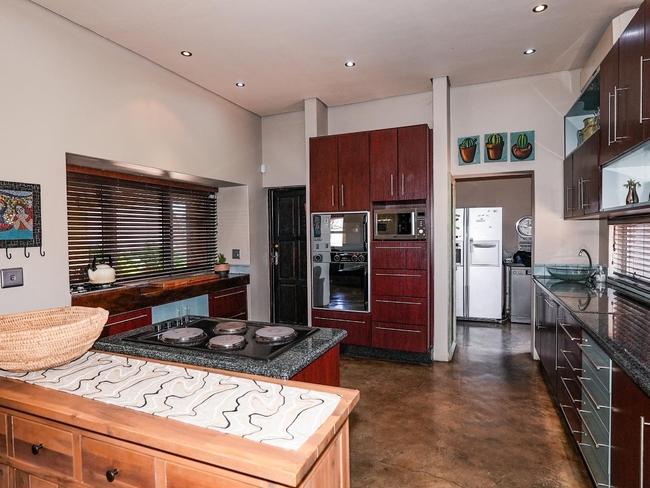 The lodge can accommodate up to 20 guests in a number of bedrooms with an open-plan kitchen, dining and lounge area, and a loft kids play room. The first bedroom is furnished with a Queen-size bed. The second bedroom is furnished with a double bed and one single bed. The third bedroom is furnished with three single beds. The fourth bedroom is furnished with two single beds. Each room contains a digital safe, hairdryer, air-conditioning, and cupboards. The large kitchen is fully equipped for self-catering and includes a stove and oven, kettle, microwave, a double-door fridge-freezer, and a dishwasher. There is a cold room for beverages. The dining area features a large dining table and chairs. The lounge boasts comfy chairs and couches, a fireplace, and a 62-inch TV with surround sound, a DVD player, and full DStv. The lounge opens to a patio with outdoor dining furniture and braai facilities.