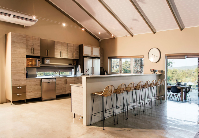 Jahensu Hillside Lodge holiday house sleeps ten guests in four bedrooms. The first room has a King-size bed and a single bed. The second room has a Queen-size bed and a sleeper couch. The third room has three single beds and the fourth room has two single beds. There is a comfortable lounge with a TV and DStv, a large dining table and a fully equipped modern kitchen.