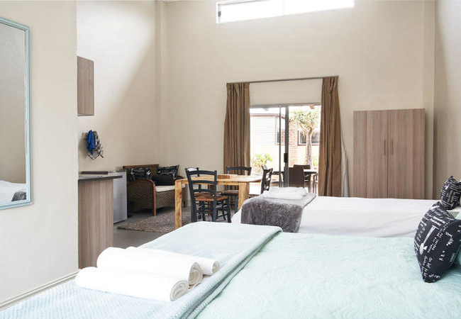 The Kokerboom King Suites are comfortable and spacious family units that can sleep up to five guests. Each suite features a king-size bed, three three-quarter beds, and is fitted with quality linen for a restful stay. The en-suite bathroom includes a shower, and the suite also offers a fully equipped kitchen with a gas stove, refrigerator, bar fridge, and a two-plate stove—ideal for self-catering. Guests can enjoy a private patio with braai facilities, perfect for outdoor dining. Surrounded by beautiful gardens and stunning views, the suites also include amenities such as Wi-Fi, a sitting area, daily cleaning service, a fan, and tea- and coffee-making facilities.