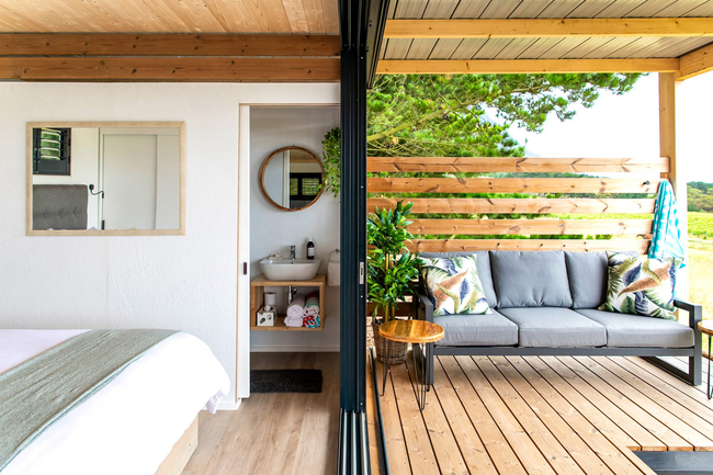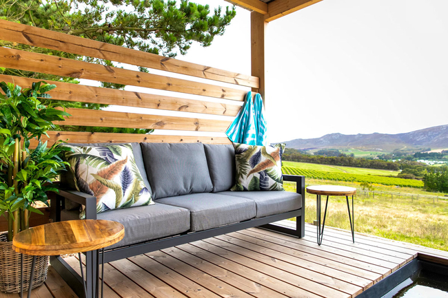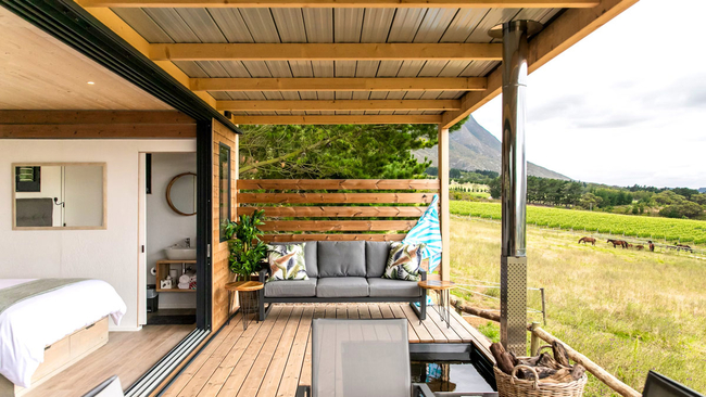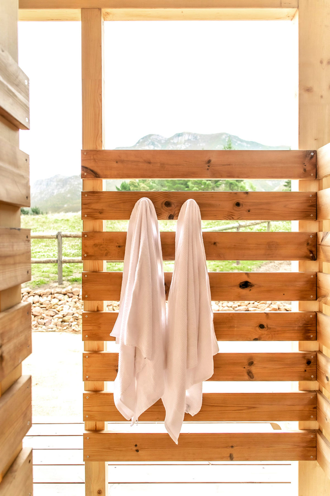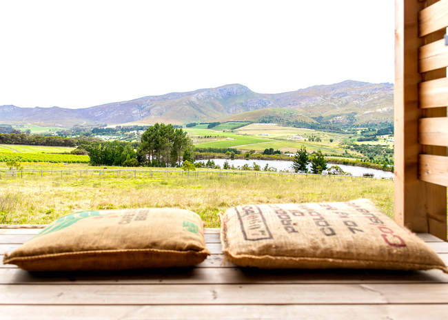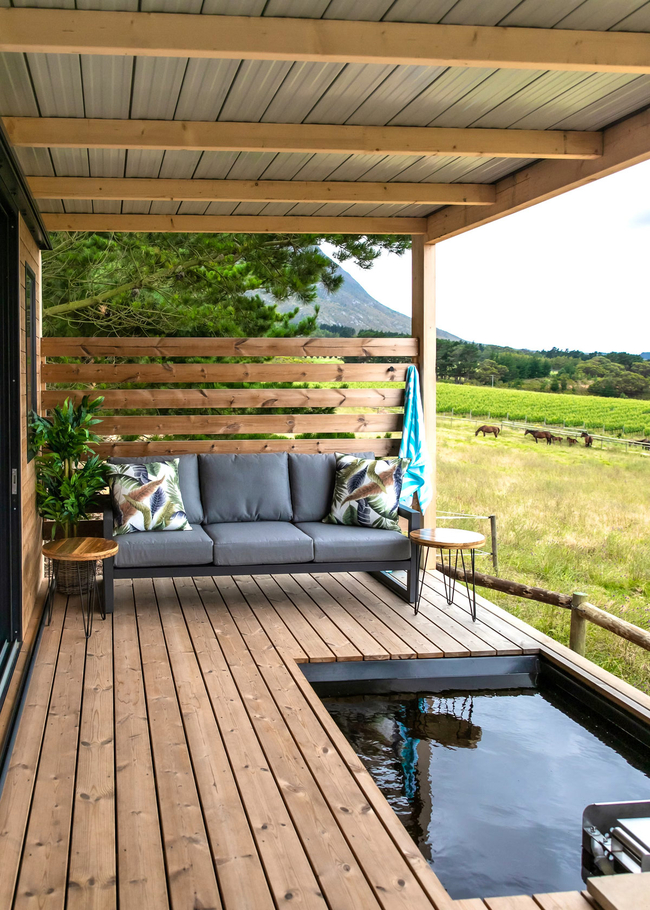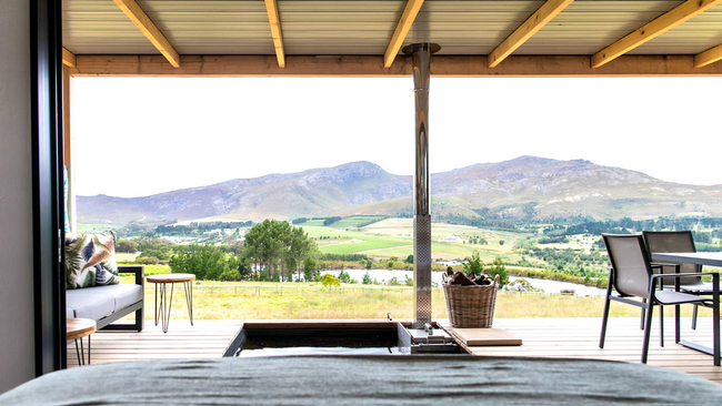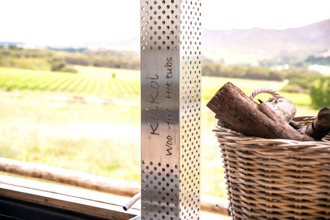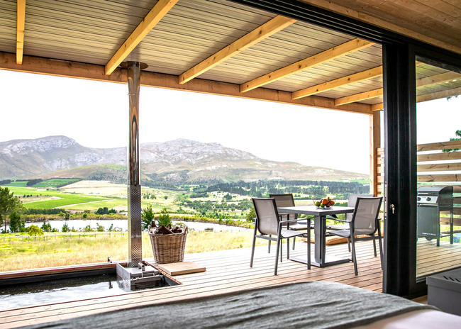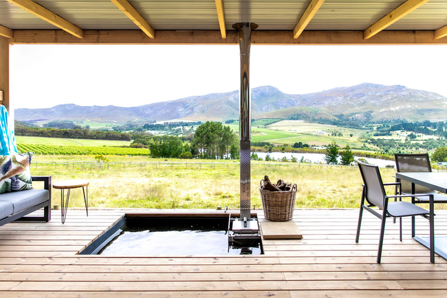 The Jay Peg Bungalow is a gorgeous two-person retreat, featuring an open-plan layout and a private wood-fired hot tub. It offers unparalleled panoramic vistas of the Hemel-en-Aarde Valley.