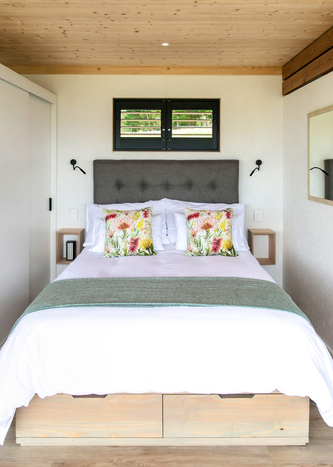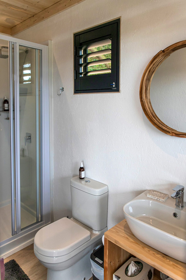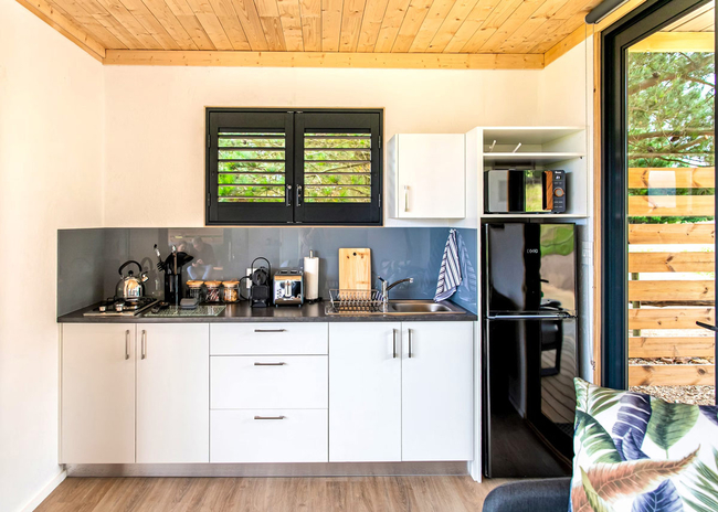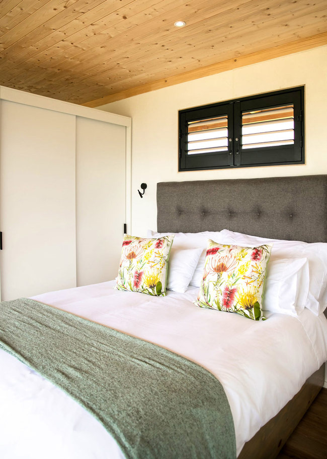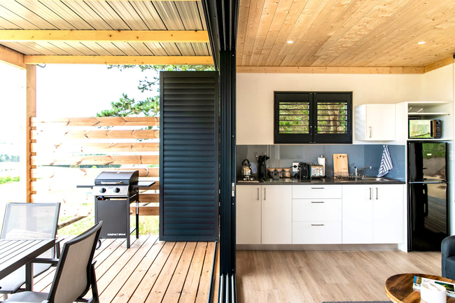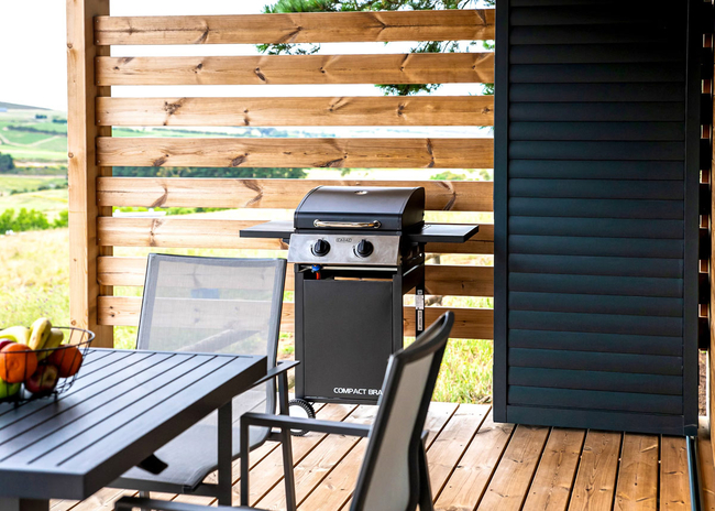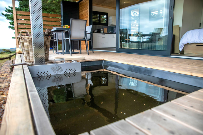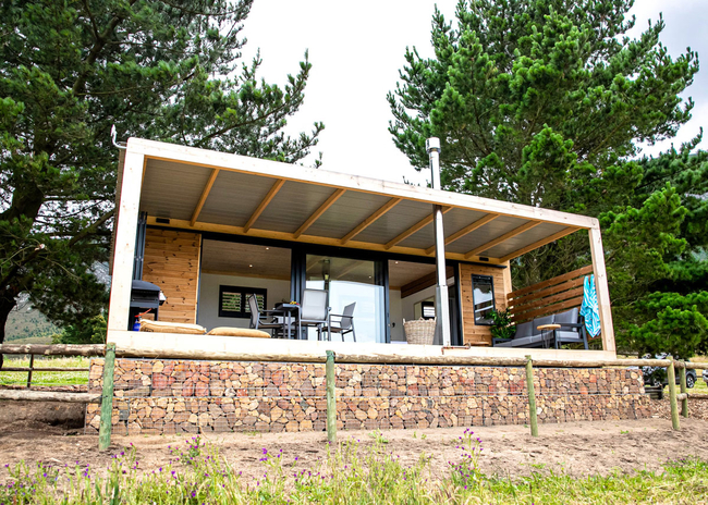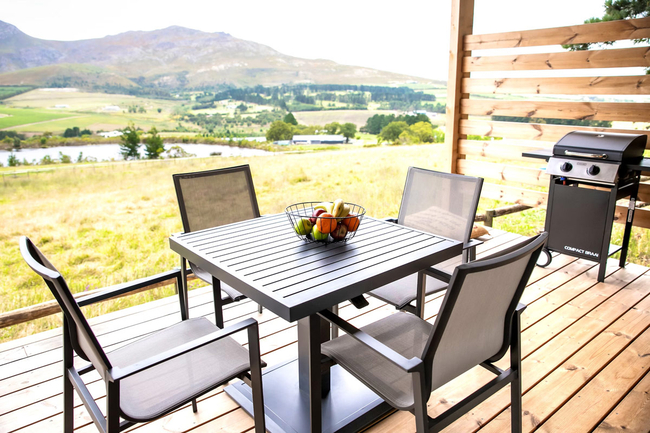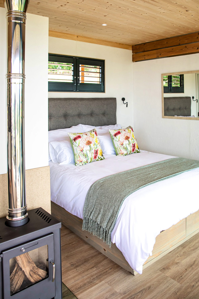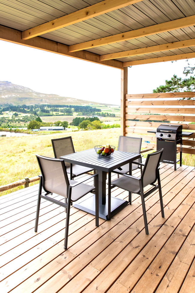 Designed for seamless indoor-outdoor living, the bungalow offers magnificent views from every angle. The kitchenette is outfitted with a two-plate gas hob, microwave, fridge-freezer, Nespresso machine, and toaster. The deck, perfect for relaxation and dining, includes a wood-fired hot tub, lounger, dining table, and gas braai. An additional outdoor shower is available for your convenience.