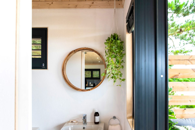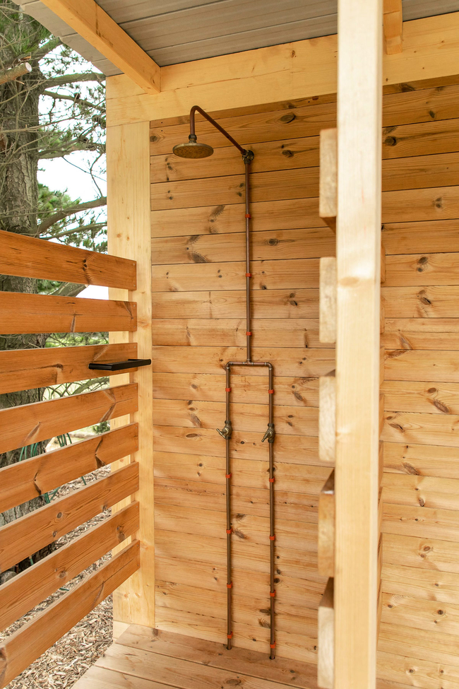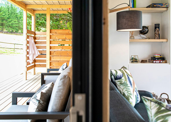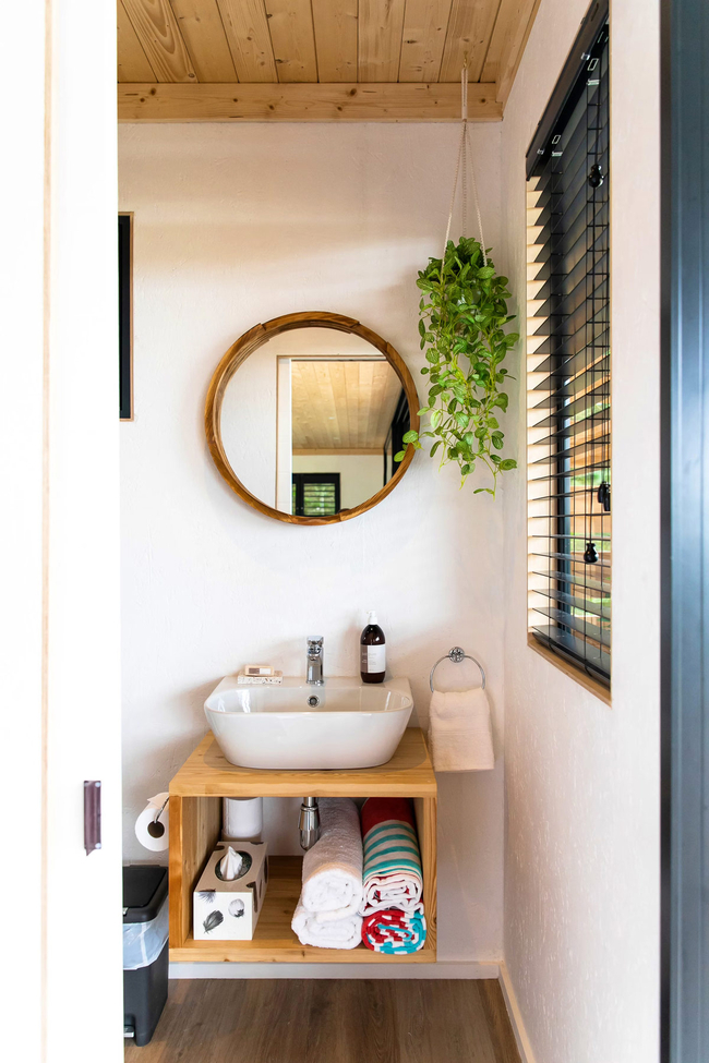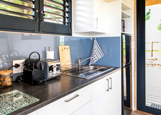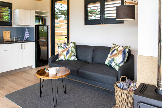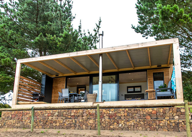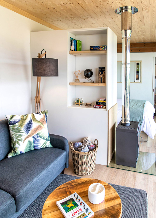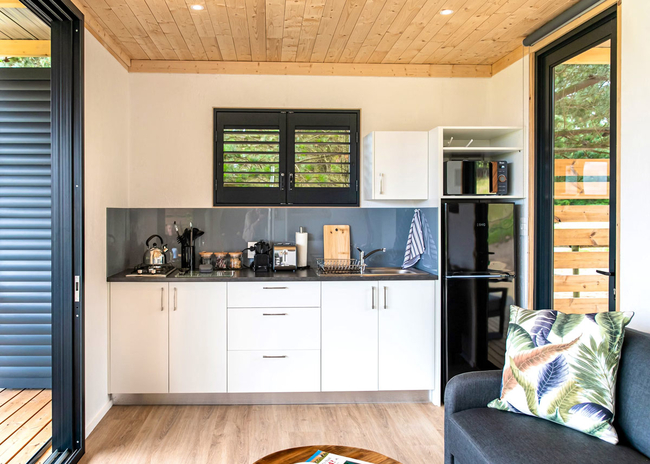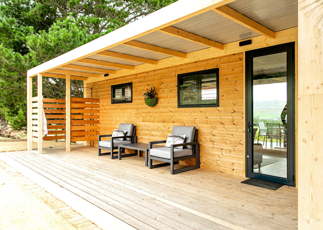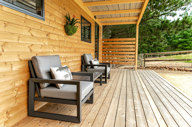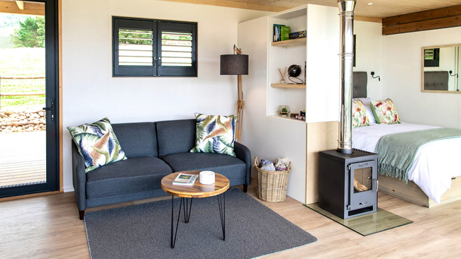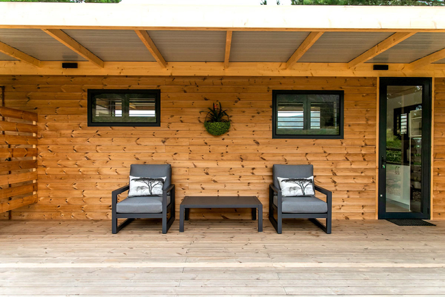 Designed for seamless indoor-outdoor living, the bungalow offers magnificent views from every angle. The kitchenette is outfitted with a two-plate gas hob, microwave, fridge-freezer, Nespresso machine, and toaster. The deck, perfect for relaxation and dining, includes a wood-fired hot tub, lounger, dining table, and gas braai. An additional outdoor shower is available for your convenience.