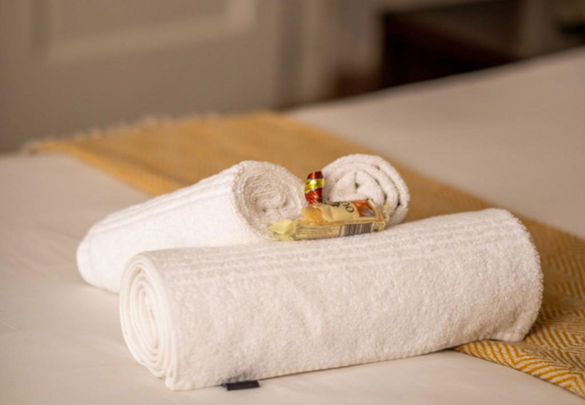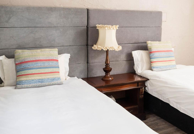 Twin Room is furnished with twin beds. The en-suite bathroom is fitted with a bath, shower, toilet and basin. Each room is equipped with a tea and coffee station, Wi-Fi, air-conditioning, bathrobes, a desk, safe and satellite TV. Breakfast is also available.