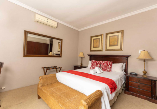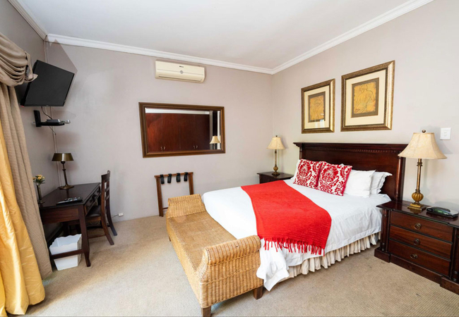 Deluxe Rooms are upstairs and furnished with a Queen-size bed. The en-suite bathroom is fitted with a bath, shower, toilet and basin. Each room has a tea and coffee station, Wi-Fi, air-conditioning, bathrobes, a desk, safe and satellite TV. Breakfast is available.