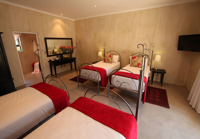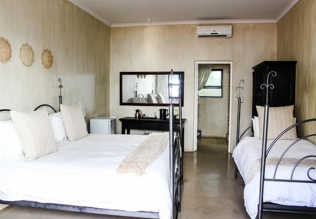 This 4-sleeper Deluxe Family Room is furnished with a Queen-size bed as well as two single beds, and a private bathroom fitted with a shower, basin and toilet. The room is equipped with an air-con, a TV with 10 selected DStv channels, a stocked mini-bar fridge, a hairdryer, and free Wi-Fi access.