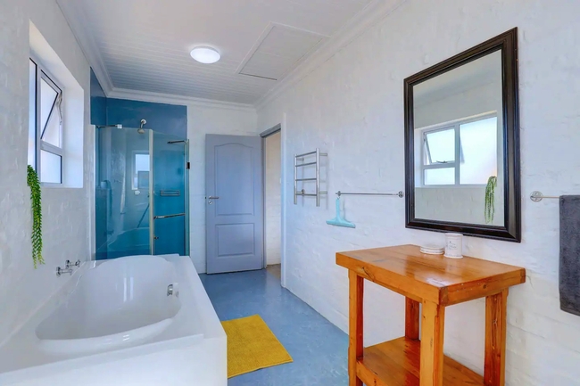 This self catering apartment is located on the second floor and has two bedrooms and two bathrooms (sleeps five guests maximum). The main bedroom is furnished with a double bed and the second bedroom has three single beds. The bathrooms have a shower or bath or both. Bed linen and towels are provided. There is an open-plan living area with a six seater dining table and a lounge which opens out to a balcony with braai facilities. The fully equipped kitchen has a fridge, a microwave, a gas stove top, a dishwasher and a washing machine.