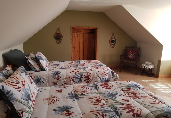Pansy has a double bed in the main bedroom and two single beds in the loft area. The rooms share a bathroom fitted with a shower. The kitchenette has a bar fridge, stove, microwave, and tea / coffee making facilities.