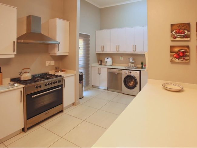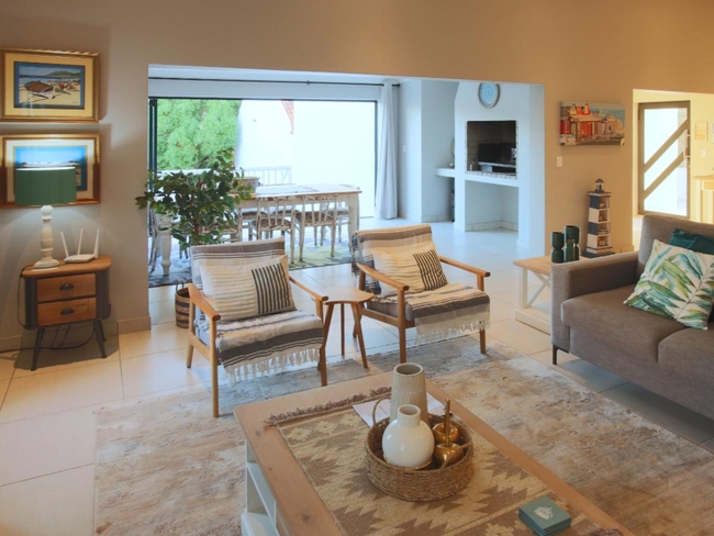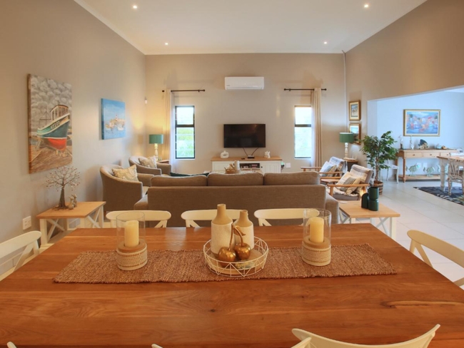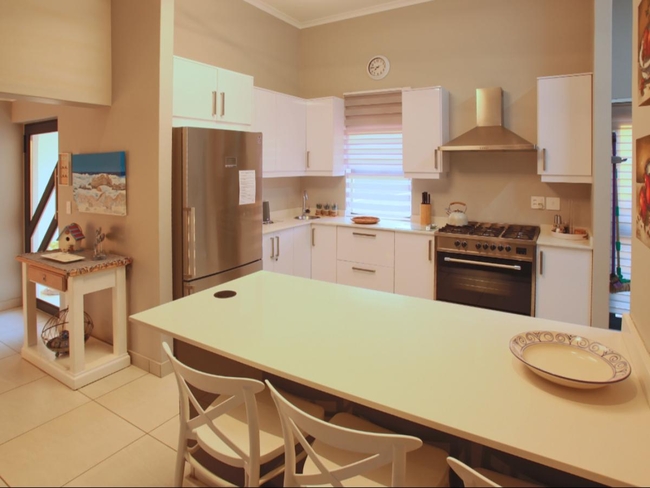 The property accommodates up to four guests, offering two bedrooms. The main bedroom is furnished with a double bed, while the second bedroom features two single beds. These rooms share a bathroom complete with both a bath and a shower. Linen and bath towels are supplied, although guests should bring their own beach towels. The main living area presents an open-plan layout. The kitchen is equipped with a gas stove, an electric oven, a microwave, a fridge-freezer, and a full set of cutlery and crockery, along with a breakfast bar and stools. A dishwasher and washing machine are also available for convenience. Adjacent to the kitchen is a dining table where guests can gather for shared meals. The lounge offers comfortable seating, a television with DStv, and an indoor braai area with an additional dining table. Complimentary Wi-Fi is provided.