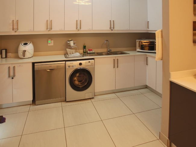 The main living area presents an open-plan layout. The kitchen is equipped with a gas stove, an electric oven, a microwave, a fridge-freezer, and a full set of cutlery and crockery, along with a breakfast bar and stools. A dishwasher and washing machine are also available for convenience.