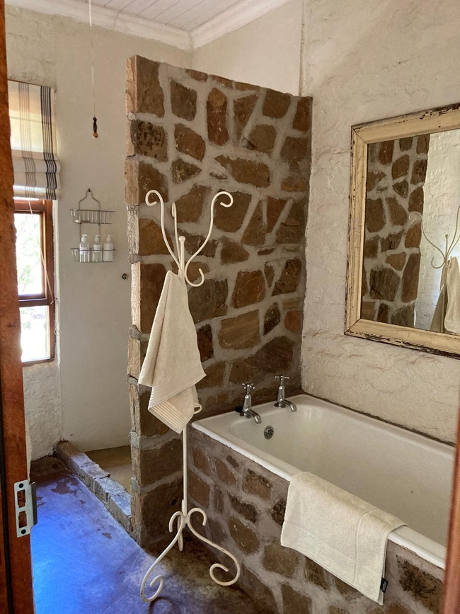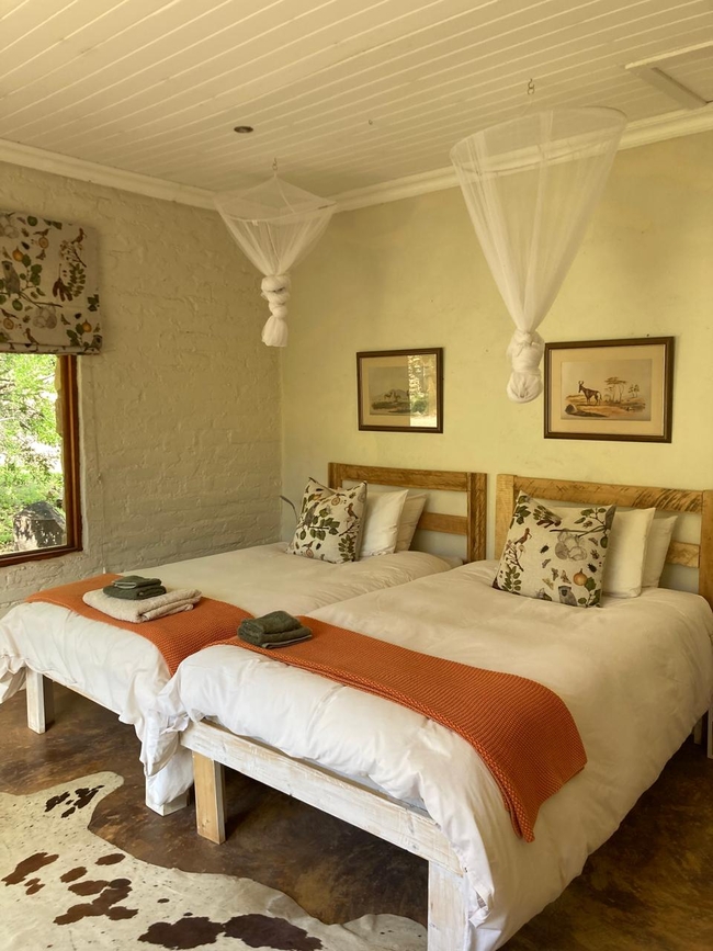 The lodge is built as a home and is made up of four bedrooms leading onto an open plan sitting / dining and kitchen area. All bedrooms have two three-quarter beds so a maximum of eight guests can be accommodated. Two of the bedrooms have en-suite bathrooms and the other two have a shared bathroom. All bathrooms have bath and shower facilities. The kitchen is well equipped. The oven / stove and fridge run off gas. The big veranda is perfect for outside living with braai facilities and outside dining area. The lights all run off solar energy. The majority of building material used to build the lodge is recycled along with the furniture which is home made from salvaged woods.