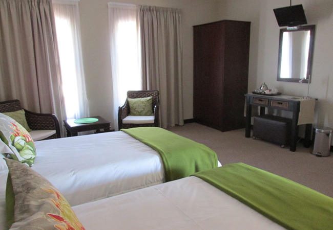 Spacious room furnished with a double bed. The en-suite bathroom is equipped with a hand basin, shower and WC. Other facilities include air-conditioning, flat screen TV with DSTV, 100 percent cotton linen, safe, coffee and tea making facilities. Free Wi-Fi is available in all the rooms.