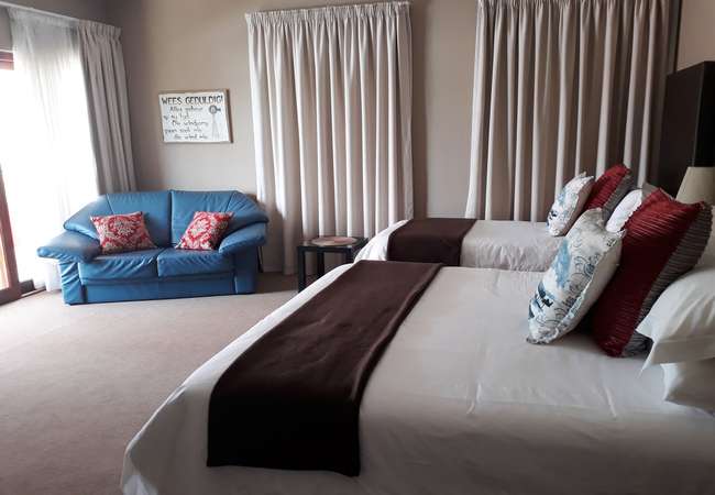 Spacious room furnished with one single bed and a sleeper couch and one Queen-size bed. Balcony. The en-suite bathroom is equipped with a separate shower and bath. Other facilities include air-conditioning, flat screen TV with DSTV, 100 percent cotton linen, safe, coffee and tea making facilities. Free Wi-Fi is available in all the rooms.