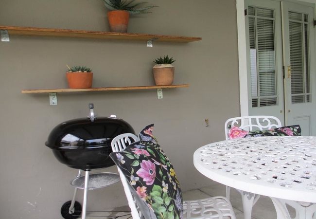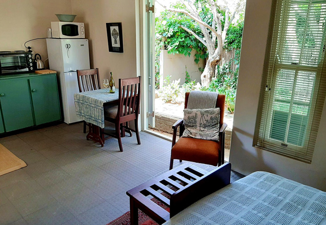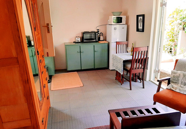 Studio with a Queen-size bed, en-suite bathroom with shower and toilet. There is a kitchenette with a fridge, coffee machine and microwave. The dining area has comfortable chairs and there is a patio where you can sit and watch the birds or braai on the portable braai.