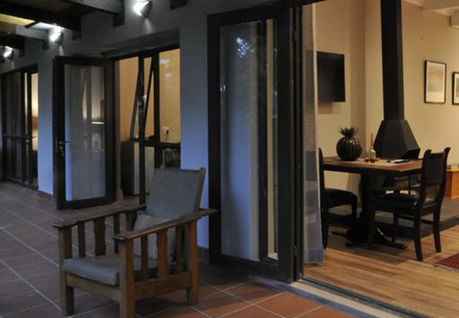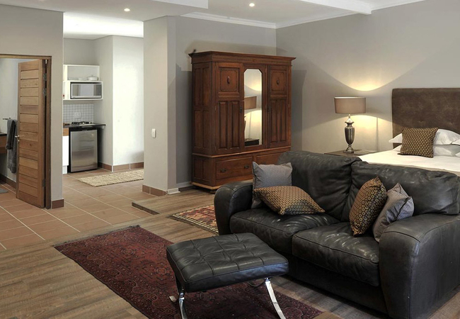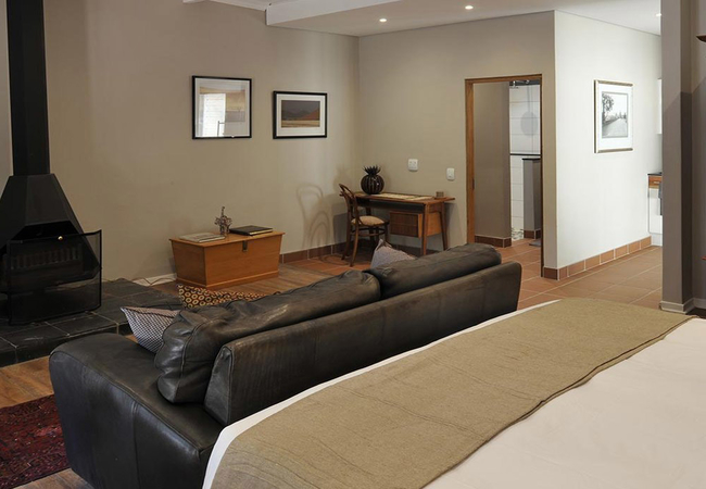 This larger room has a fireplace for the cold Free State winters. There is a King-size bed, sleeper couch, en-suite bathroom with a shower, kitchenette with microwave, hob, kettle and fridge. TV with DStv and free Wi-Fi.
