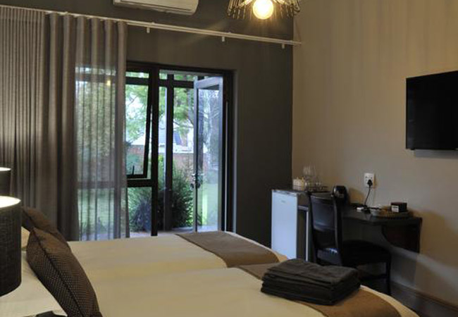 This room has twin beds, en-suite bathroom with shower. The room leads out onto a delightful veranda, which serves as an extension of the room, to enjoy the lovely well-established garden and the tranquillity of the neighbourhood. Complimentary tea / coffee, air conditioning, TV with DStv and free Wi-Fi.