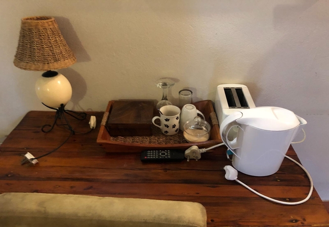 A self-catering studio equipped with a small stove and microwave. It feature a double room furnished with one double bed and two single bed. The en-suite bathroom is equipped with a shower, hand basin and WC. The studio is also equipped with a bar fridge and tea- and coffee-making facilities. Other facilities include bathroom amenities, wireless internet connection, Television with DSTV/ Satellite television. iPod docking station, desk, patio, kitchenette, microwave, non-smoking, refrigerator and a sitting area.